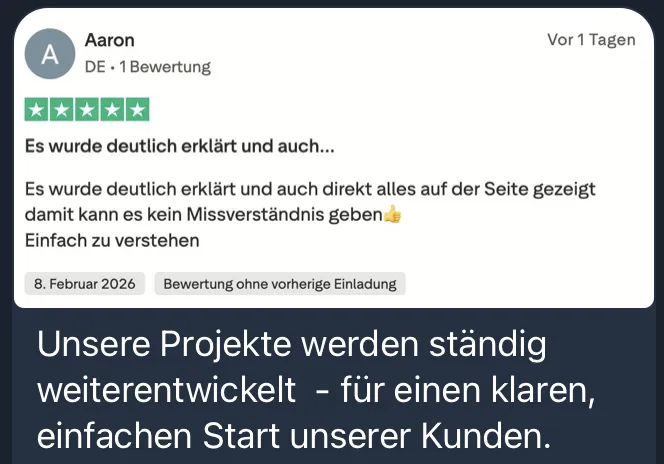 Alle auf dieser Seite zu findenden Empfehlungen, Resultate, Erfolgsgeschichten oder Umsätze stammen völlig ohne jegliche Kompensation von echten Kunden. Ich weise darauf hin, dass es sich hierbei um keine „Gelange auf schnellstem Wege zu Reichtum“-Strategien handelt.
